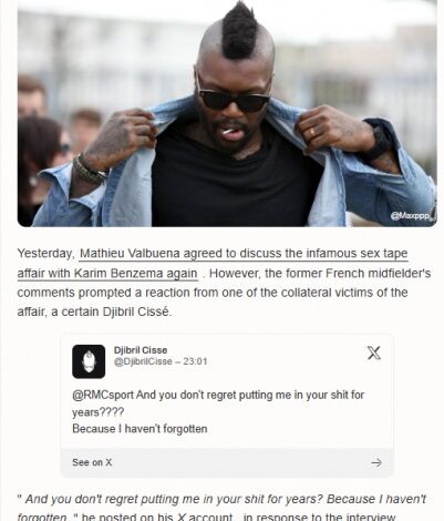 Ο Ματιέ Βαλμπουενά αναφέρθηκε και πάλι στην περιβόητη υπόθεση εκβιασμού του το 2015, με ένα βίντεο σεξουαλικού περιεχομένου, στην οποία ο Καριμ Μπενζεμά είχε άμεση εμπλοκή, όπως έκρινε το αρμόδιο δικαστήριο το 2022 (το οποίο και τον καταδίκασε). Οι δηλώσεις του προκάλεσαν την αντίδραση του Τζιμπρίλ Σισέ.