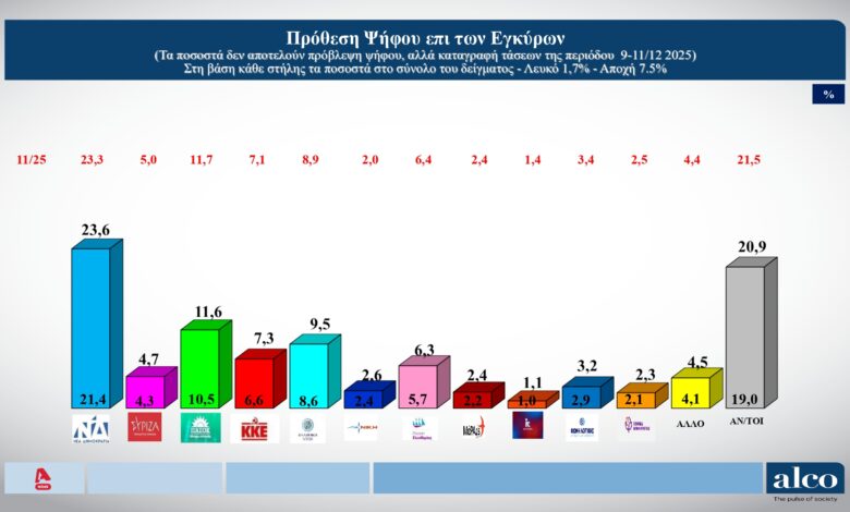 Δημοσκόπηση Alco: Στις 12 μονάδες η διαφορά ΝΔ και ΠΑΣΟΚ