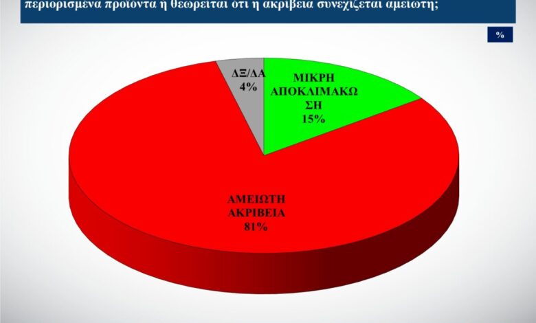 Στην ερώτηση αν έχουν παρατηρήσει αποκλιμάκωση στις τιμές, οι πολίτες απάντησαν στο πλαίσιο της δημοσκόπησης της Alco σε ποσοστό 81% ότι συνεχίζεται αμείωτη η ακρίβεια.