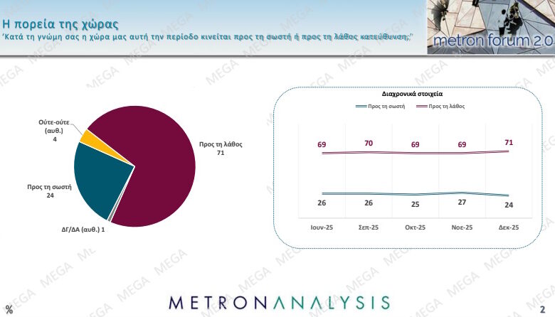 Η χώρα κινείται προς τη λάθος κατεύθυνση αυτή την περίοδο, απάντησε το 71% των ανθρώπων που ρωτήθηκαν στη δημοσκόπηση της Metron Analysis, ενώ σε ποσοστό 72% ο κόσμος αξιολογεί αρνητικά την κυβέρνηση. Το 69% αξιολογεί αρνητικά τον Κυριάκο Μητσοτάκη για τον τρόπο που ασκεί τα καθήκοντά του.