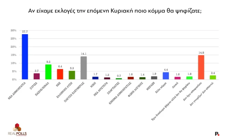 Στην πρόθεση ψήφου η Νέα Δημοκρατία είναι πρώτη με 27,7%, η Πλεύση Ελευθερίας μετρήθηκε στο 14,1% ενώ το ΠΑΣΟΚ είναι ξανά τρίτο στο 9,2%.