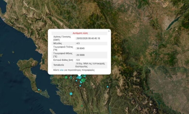 Νέος σεισμός 4,5 Ρίχτερ σημειώθηκε το πρωί της Παρασκευής (20/03) στη Θεσπρωτία.