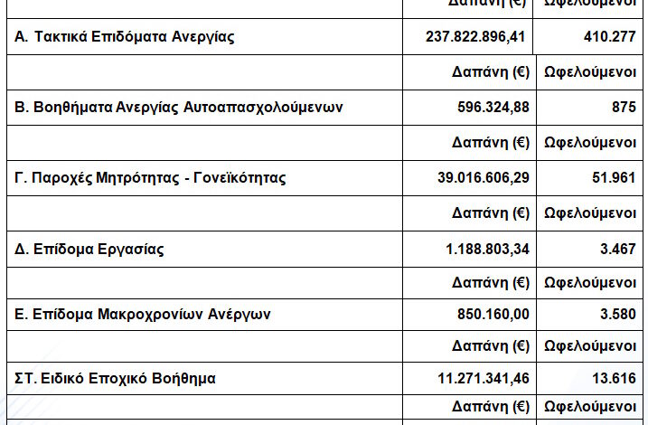 Παρουσιάζονται αναλυτικά οι συνολικές δαπάνες και ο αριθμός ωφελουμένων, ανά κατηγορία παροχών καθώς και οι δαπάνες για τα ειδικά προγράμματα απασχόλησης οργανωμένες σε 8 βασικές κατηγορίες.