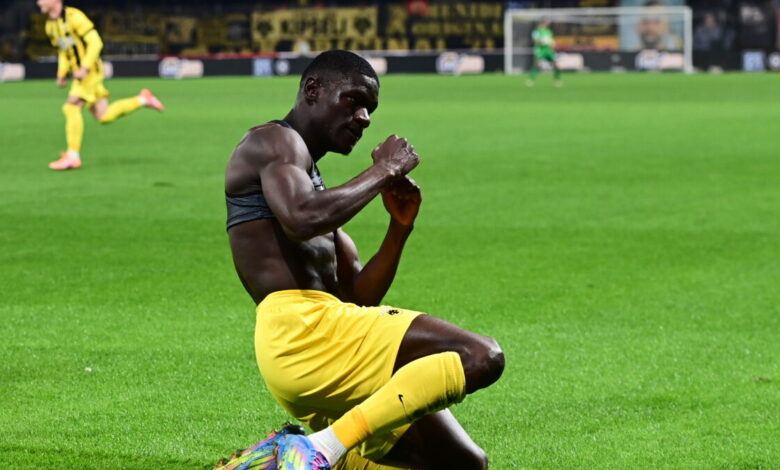 Ο Ζίνι πανηγυρίζει κόντρα στον Άρη (ΓΙΩΡΓΟΣ ΜΑΤΘΑΙΟΣ / EUROKINISSI)