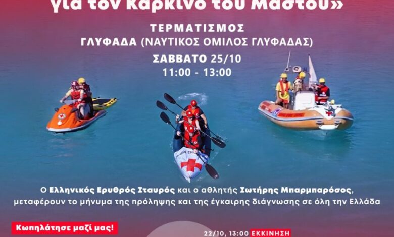 Ο Ελληνικός Ερυθρός Σταυρός διοργανώνει το Σάββατο (25/10) και ώρες 11:00 έως 13:00, στον Ναυτικό Όμιλο Γλυφάδας (Διαδόχου Παύλου 42), μεγάλη εκδήλωση ενημέρωσης, ευαισθητοποίησης και πρόληψης για τον καρκίνο του μαστού.