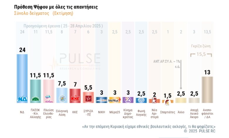 Συγκεκριμένα σύμφωνα με τη δημοσκόπηση της Pulse για το κεντρικό δελτίο ειδήσεων του ΣΚΑΙ η ΝΔ βρίσκεται στην πρώτη θέση με 29%, ενώ στη δεύτερη ισοβαθμούν ΠΑΣΟΚ και Πλεύση Ελευθερίας με ποσοστό 13,5%.