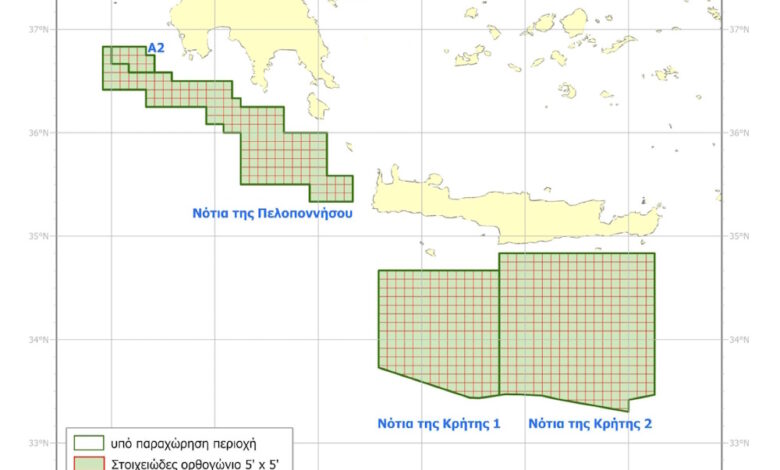 Πρόκειται για τις περιοχές συνολικής έκτασης 47.000 τετραγωνικών χιλιομέτρων νοτίως της Πελοποννήσου (περιοχές «Α2» και «Νότια της Πελοποννήσου») και στις θαλάσσιες περιοχές νοτίως της Κρήτης (περιοχές «Νότια της Κρήτης 1» και «Νότια της Κρήτης 2») οι οποίες μετά την υπογραφή των σχετικών συμβάσεων, την έγκρισή τους από το Ελεγκτικό Συνέδριο και την κύρωσή τους από τη Βουλή παραχωρούνται για έρευνες υδρογονανθράκων στις κοινοπραξίες των ομίλων Chevron – HELLENiQ Energy.