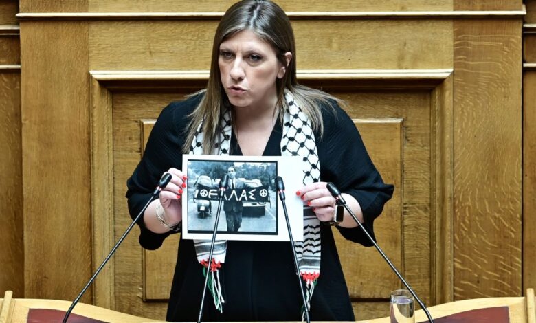 Με μαντήλα της Παλαιστίνης στον λαιμό, εμφανίστηκε η πρόεδρος της Πλεύσης Ελευθερίας, Ζωή Κωνσταντοπούλου, στην Ολομέλεια της Βουλής κατά την επετειακή αναφορά στη μνήμη του Γρηγόρη Λαμπράκη σήμερα Δευτέρα (26.5.25).
