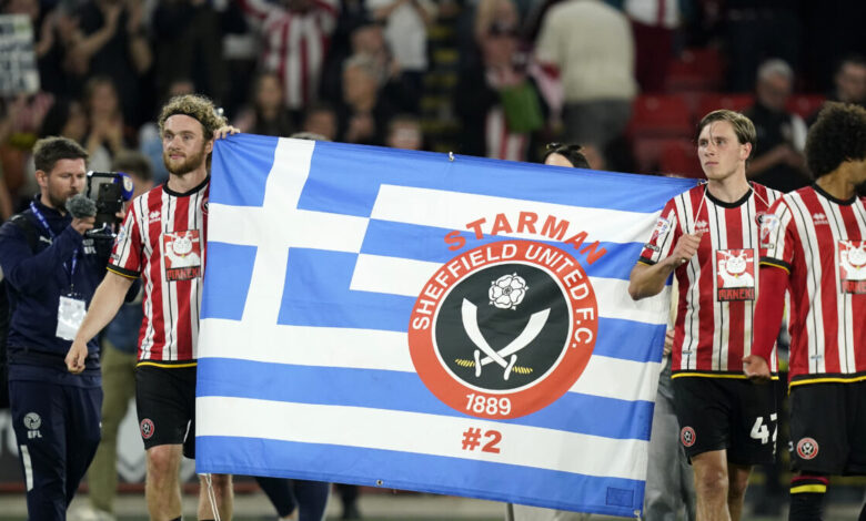 Η Σέφιλντ Γιουνάιτεντ «υπέγραψε» τον υποβιβασμό της Σέφιλντ Γουένσντεϊ και το πανηγύρισε με ελληνική σημαία για τον Τζορτζ Μπάλντοκ