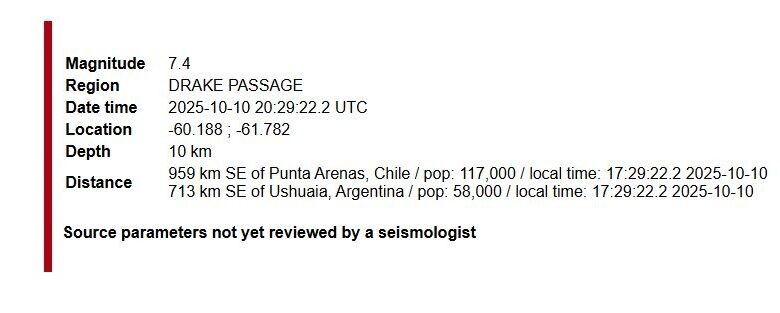 Ένας ισχυρός σεισμός 7,4 της κλίμακας Ρίχτερ καταγράφηκε αργά το βράδυ της Παρασκευής από το Ευρωμεσογειακό Σεισμολογικό Κέντρο, στον Πορθμό του Ντρέικ στη Χιλή.