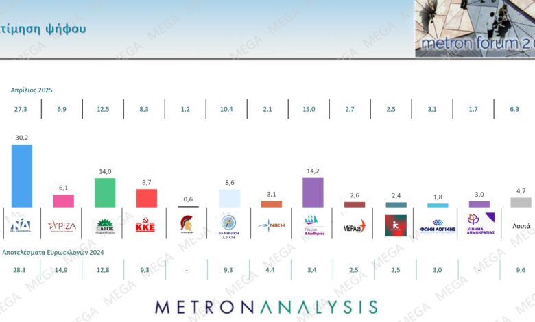 Ανακάμπτει η Νέα Δημοκρατία σύμφωνα με τη δημοσκόπηση της Metron Analysis για το Mega ενώ ξεπέρασε το ψυχολογικό φράγμα του 30%.