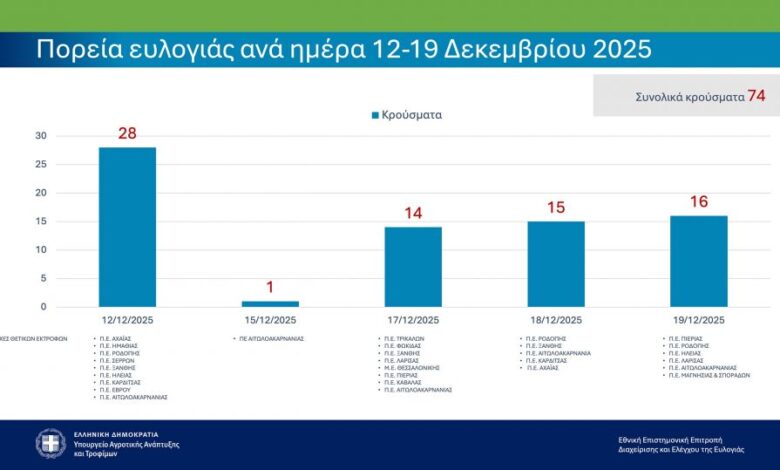 Ειδικότερα, την τελευταία εβδομάδα (12–19 Δεκεμβρίου 2025) καταγράφηκαν 74 νέα κρούσματα σε 17 περιοχές: