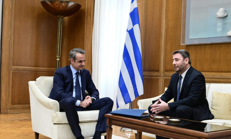 Ο πρωθυπουργός, Κυριάκος Μητσοτάκης, και ο πρόεδρος του ΠΑΣΟΚ, Νίκος Ανδρουλάκης (Φωτογραφία αρχείου / ΤΑΤΙΑΝΑ ΜΠΟΛΑΡΗ/EUROKINISSI)