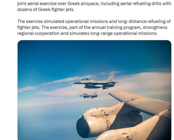 «Η Ισραηλινή Πολεμική Αεροπορία και η Ελληνική Πολεμική Αεροπορία πραγματοποίησαν κοινή αεροπορική άσκηση πάνω από τον ελληνικό εναέριο χώρο, συμπεριλαμβανομένων ασκήσεων εναέριου ανεφοδιασμού με δεκάδες ελληνικά μαχητικά αεροσκάφη» αναφέρει σε ανάρτησή του ο ισραηλινός στρατός.