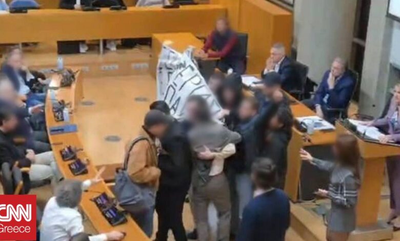 Η παρουσία τους προκάλεσε ένταση, με μέλη του Δημοτικού Συμβουλίου Νέων να κατευθύνουν τα άτομα του Ρουβίκωνα προς την έξοδο της αίθουσας.