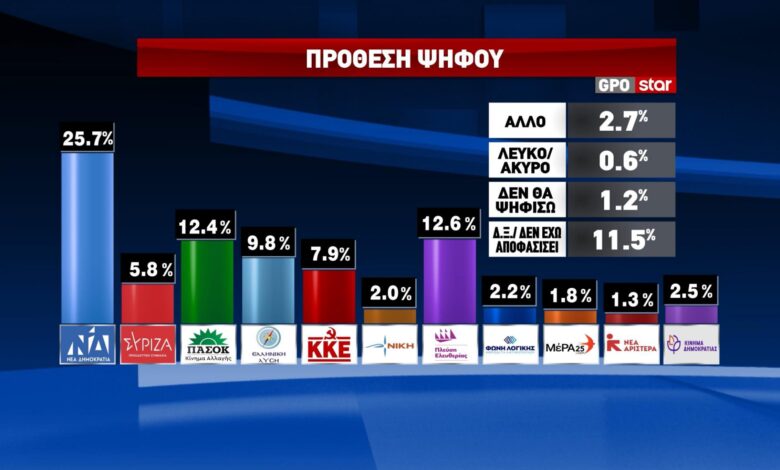 Με 13,1 μονάδες προηγείται η ΝΔ – «Μάχη» Πλεύσης Ελευθερίας και ΠΑΣΟΚ για τη δεύτερη θέση
