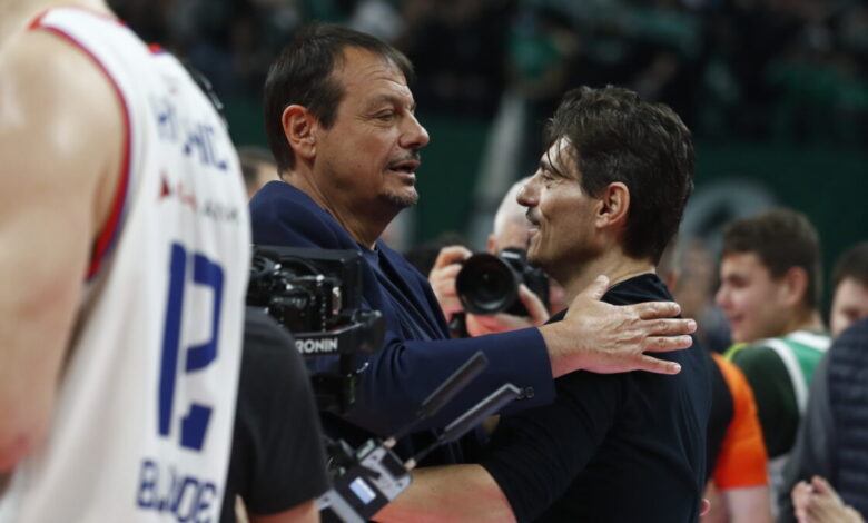 Ο Δημήτρης Γιαννακόπουλος αγκαλιά με τον Εργκίν Αταμάν/ (ΣΤΕΛΙΟΣ ΣΤΕΦΑΝΟΥ / EUROKINISSI)