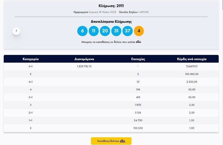 Οι τυχεροί αριθμοί στη σημερινή κλήρωση είναι οι εξής: 6, 11, 20, 31, 37 και τζόκερ ο αριθμός 4.