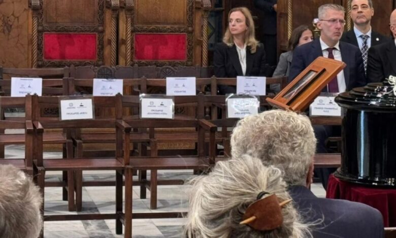 Τα άδεια καθίσματα με τα καρτελάκια της αντιπολίτευσης στην κηδεία του τραγουδοποιού
