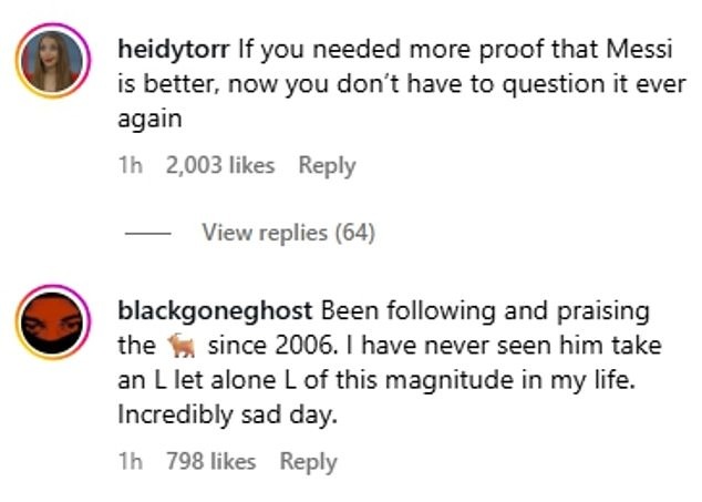 “Δεν τον έχω δει ποτέ να χάνει, πόσο μάλλον με τέτοιο τρόπο. Πραγματικά θλιβερή μέρα” ανέφερε ένας χρήστης, ενώ ένας άλλος σχολίασε: “Αν ήθελες άλλη απόδειξη ότι ο Μέσι είναι καλύτερος, τώρα την έχεις”.