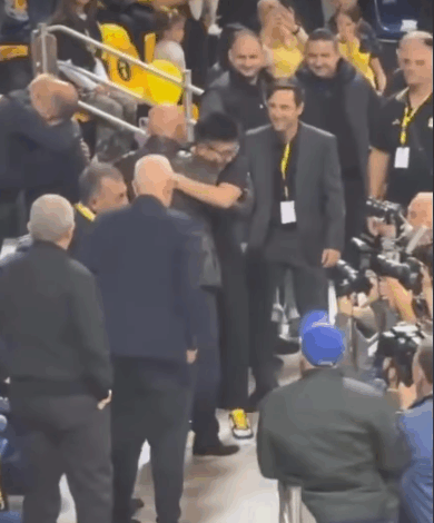 Ο Ρίτσαρντ Σιάο κατά την είσοδό του στο παρκέ πήγε κατευθείαν στις εξέδρες που ήταν ο Νίκος Γκάλης για να τον χαιρετήσει και να τον αγκαλιάσει στην πρώτη τους κοινή παρουσία στο γήπεδο του Άρη Betsson.