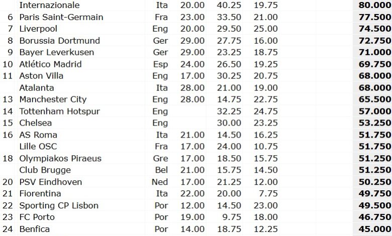 Οι ομάδες που συμπληρώνουν τις πρώτες 17 θέσεις είναι οι: Άρσεναλ, Μπαρτσελόνα, Μπάγερν Μονάχου, Ρεάλ Μαδρίτης, Ίντερ, Παρί, Λίβερπουλ, Ντόρτμουντ, Μπάγερ Λεβερκούζεν, Ατλέτικο Μαδρίτης, Αστον Βίλα, Αταλάντα, Μάνστσεστερ Σίτι, Τότεναμ, Τσέλσι, Ρόμα, Λιλ.