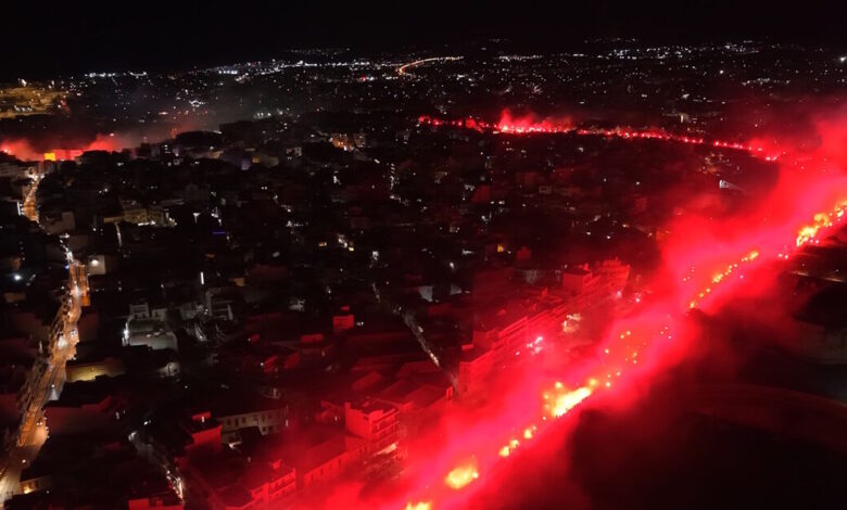 Η νύχτα έγινε μέρα στην πόλη της Κρήτης, με εκατοντάδες καπνογόνα να φωτίζουν το κέντρο της πόλης και τον ουρανό σε ένα φαντασμαγορικό pyro show των οπαδών, για τον έναν αιώνα του ΟΦΗ.
