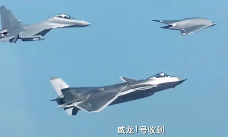 Το μη επανδρωμένο αεροσκάφος GJ-11 (δεξιά) πετάει μπροστά συνδεδεμένο με το μαχητικό αεροσκάφος J-20, στο πρώτο βίντεο που δείχνει τα επανδρωμένα και μη επανδρωμένα αεροσκάφη της Κίνας να συνεργάζονται.
