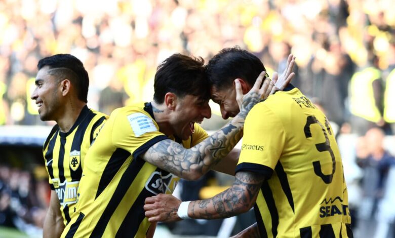 Οι παίκτες της ΑΕΚ πανηγυρίζουν το γκολ/ (ΜΑΡΙΛΙΑ ΒΑΣΙΛΑΚΟΠΟΥΛΟΥ / EUROKINISSI)