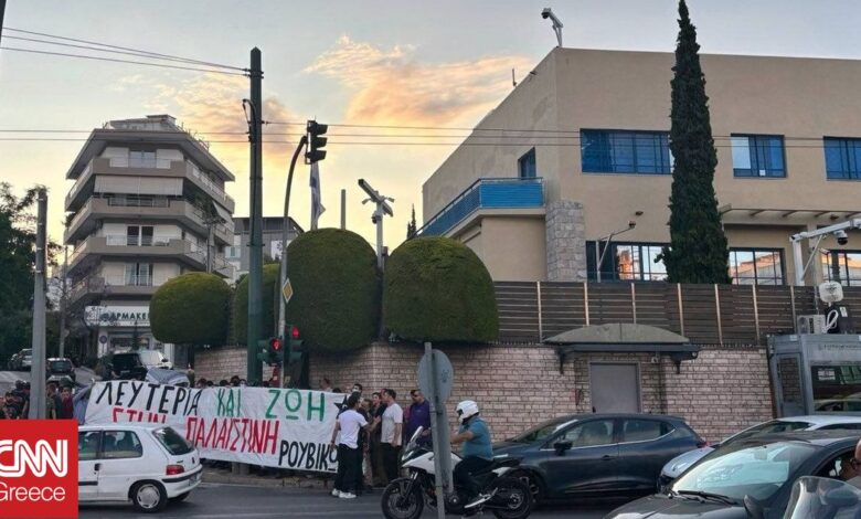 Μέλη του Ρουβίκωνα συγκεντρώθηκαν έξω από την πρεσβεία του Ισραήλ στην Κατεχάκη, άνοιξαν πανό, ενώ τοποθέτησαν ένα ακόμα σε μια γειτονική οικοδομή