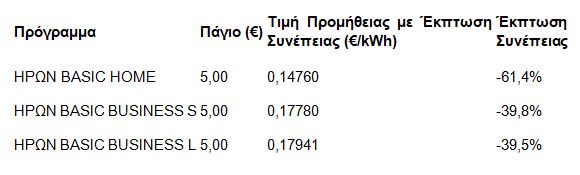 Σύμφωνα με το εργαλείο σύγκρισης τιμών της ΡΑΑΕΥ και τις ανακοινώσεις των παρόχων, τα τιμολόγια του ΗΡΩΝ παραμένουν χαμηλότερα από το σύνολο σχεδόν των υπόλοιπων αντίστοιχων «πράσινων» τιμολογίων. Ο πάροχος κράτησε σταθερή την τιμή στα 0,1476 €/kWh, ενισχύοντας την έκπτωση συνέπειας στο 61,4%.