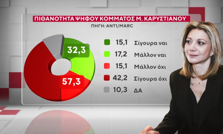Σε ερώτηση σχετικά με την πιθανότητα ψήφου ενός κόμματος της Μαρίας Καρυστιανού, το 32,3% απαντά σίγουρα ναι και μάλλον ναι (15,1% και 17,2%) και το 57,3% απάντησε μάλλον και σίγουρα όχι (15,1% και 42,2%).