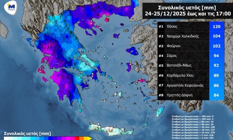 Σύμφωνα με το δίκτυο αυτόματων μετεωρολογικών σταθμών του Εθνικού Αστεροσκοπείου Αθηνών / meteo.gr, το ύψος βροχής στη Θάσο το προαναφερόμενο διήμερο έφτασε τα 120 mm (έως το απόγευμα των Χριστουγέννων), και ακολούθησαν Νεοχώρι Χαλκιδικής με 104 χιλιοστά και Φούρνοι με 102.