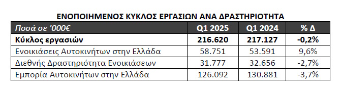 Ο Κύκλος εργασιών από τη δραστηριότητα Ενοικιάσεων Αυτοκινήτων στην Ελλάδα αυξήθηκε στο πρώτο τρίμηνο του 2025 κατά 9,6% σε σχέση με το πρώτο τρίμηνο του 2024 αγγίζοντας τα 58,7 εκατ. ευρώ, με την αύξηση να προέρχεται τόσο από τις βραχυχρόνιες όσο και από τις μακροχρόνιες μισθώσεις.