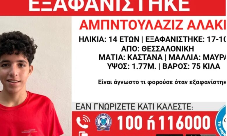 Πρόκειται για τον Αμπντουλαζίζ Αλακραά, 14 ετών, Αιγυπτιακής καταγωγής, ο οποίος εξαφανίστηκε το πρωί της Παρασκευής (17/10/25 και ώρα 10:30 πμ) από χώρο φιλοξενίας στη περιοχή του Ωραιοκάστρου Θεσσαλονίκης
