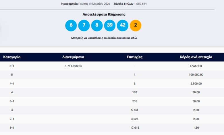 Οι τυχεροί αριθμοί που ανέδειξε η αποψινή κλήρωση είναι: 6, 7, 8, 39, 42 και Τζόκερ το 2.
