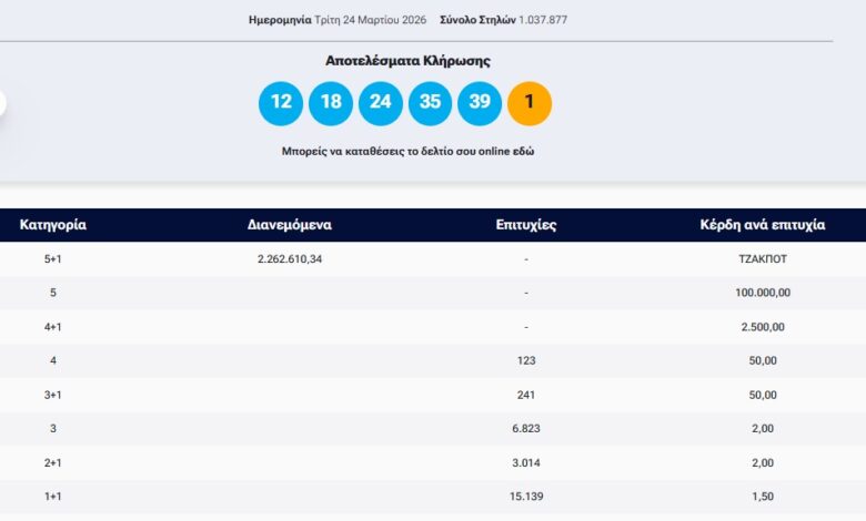 Οι τυχεροί αριθμοί που ανέδειξε η αποψινή κλήρωση είναι: 12, 18, 24, 35, 39 και Τζόκερ το 1.