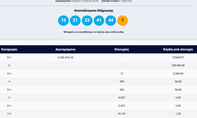 Οι τυχεροί αριθμοί που ανέδειξε η αποψινή κλήρωση είναι: 15, 21, 22, 41, 44 και Τζόκερ το 1.