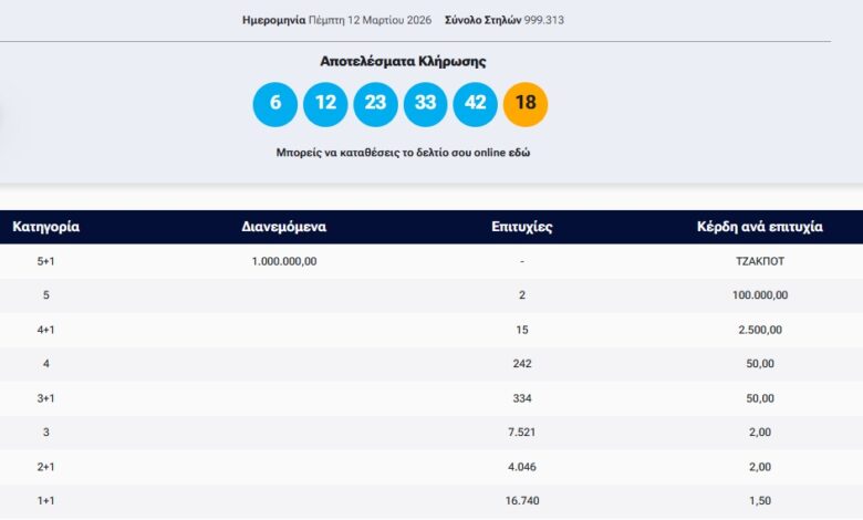 Οι τυχεροί αριθμοί που ανέδειξε η αποψινή κλήρωση είναι: 6, 12, 23, 33, 42 και Τζόκερ το 18.
