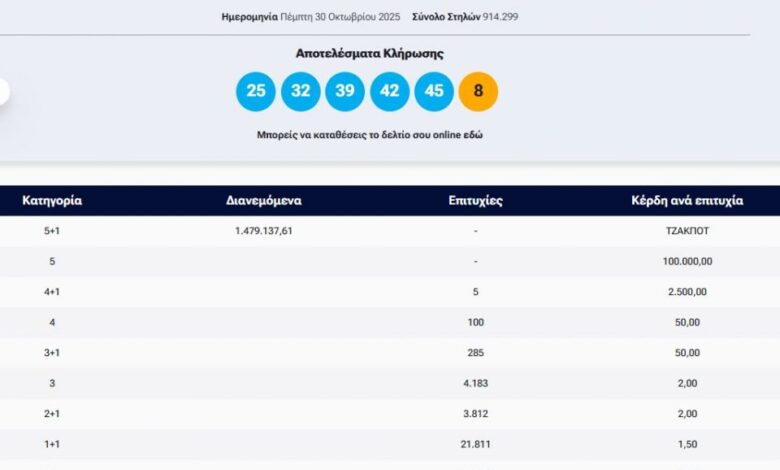 Τζόκερ: Οι τυχεροί αριθμοί που κερδίζουν πάνω από 1.400.000 ευρώ