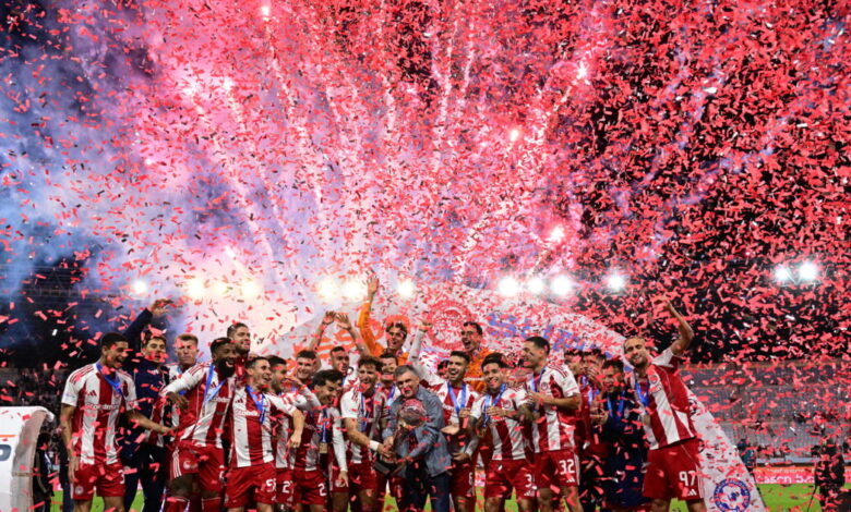 Οι παίκτες του Ολυμπιακού,ο κόσμος και ο Βαγγέλης Μαρινάκης πανηγύρισαν έντονα τον πρώτο τίτλο της σεζόν, που ακολούθησε μετά το περσινό νταμπλ στην Ελλάδα.