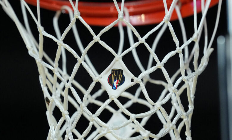 Διχτάκι μπασκέτας σε αγώνα του NBA με το λογότυπο του πρωταθλήματος / Reuters / Kirby Lee-Imagn Images