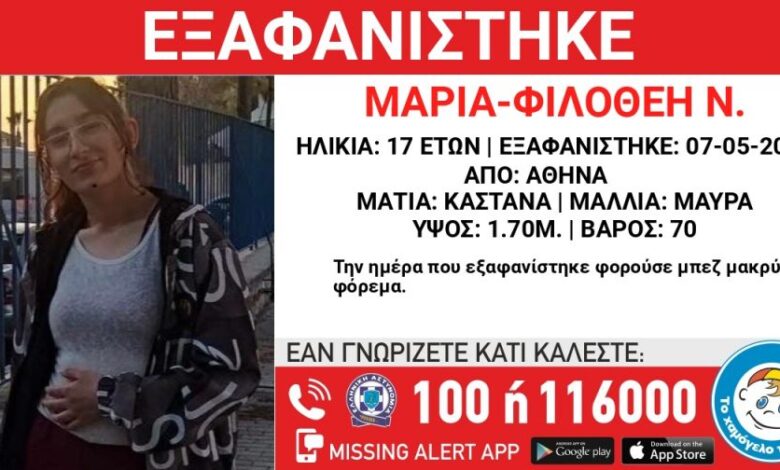Στις 07/05/25, στις 17:30 το απόγευμα, εξαφανίστηκε από την περιοχή της Αθήνας, η Μαρία – Φιλοθέη, Ν., 17 ετών. Το Χαμόγελο του Παιδιού ενημερώθηκε σήμερα, 12/05/25 και προχώρησε άμεσα στη δημοσιοποίηση των στοιχείων της ανήλικης, κατόπιν εισαγγελικής εντολής, καθώς συντρέχουν λόγοι που θέτουν την ζωή της σε κίνδυνο. Η Μαρία – Φιλοθέη, Ν., 17 ετών, έχει ύψος 1,70 μ., βάρος 70 κιλά, έχει μαύρα μαλλιά και καστανά μάτια. Την ημέρα που εξαφανίστηκε φορούσε μπεζ μακρύ φόρεμα.