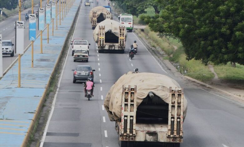 Φορτηγά μεταφέρουν άρματα μάχης ανατολικά από τη Βαλένθια της Βενεζουέλας, μετά την ανακοίνωση της κυβέρνησης για στρατιωτική κινητοποίηση μετά την ανάπτυξη πολεμικών πλοίων από τις ΗΠΑ στα ανοικτά των ακτών της Βενεζουέλας.
