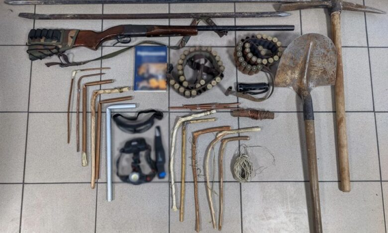 Σε βάρος των δύο ημεδαπών ηλικίας 63 και 30 ετών και ενός αλλοδαπού 60 ετών σχηματίστηκε δικογραφία για εγκληματική οργάνωση, παράβαση της νομοθεσίας για την προστασία των αρχαιοτήτων και εν γένει της πολιτιστικής κληρονομιάς κατ’ εξακολούθηση, καθώς και για παράβαση της νομοθεσίας περί όπλων.