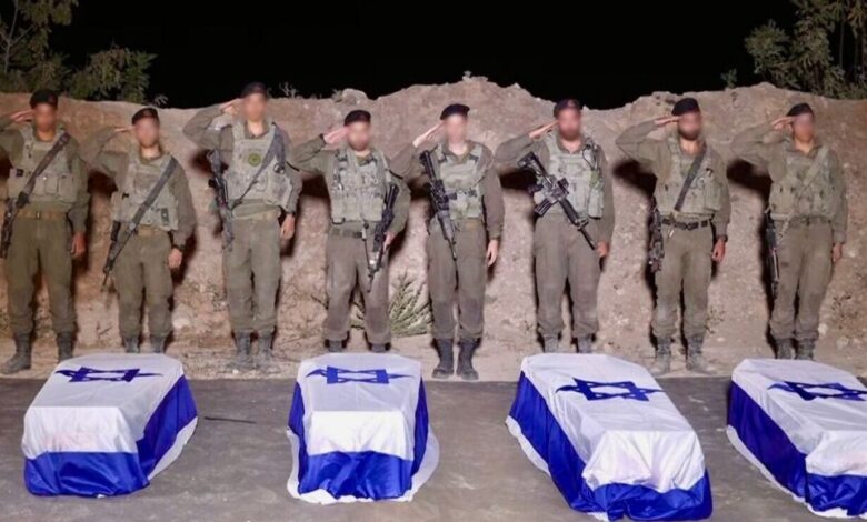 Στρατιώτες του Ισραηλινού Στρατού χαιρετούν πάνω από τα φέρετρα που περιέχουν τις σορούς των δολοφονημένων ομήρων στη Λωρίδα της Γάζας
