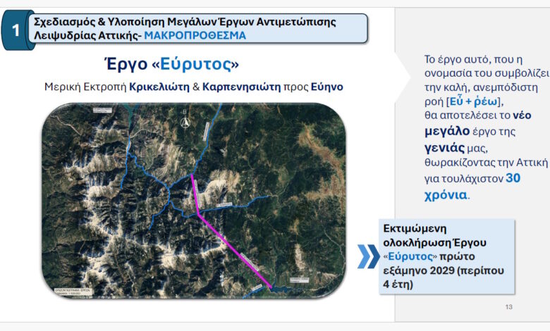 Το μεγάλο έργο της γενιάς μας είναι ο Εύρυτος: η μερική Εκτροπή Κρικελιώτη και Καρπενησιώτη προς τον Εύηνο. Το έργο αυτό συμβολίζει την καλή, ανεμπόδιστη ροή [Εὖ + ῥέω] και θα θωρακίσει την Αττική για τα επόμενα 30 χρόνια. Εκτιμάται ότι η ολοκλήρωση του Έργου «Εύρυτος» θα πραγματοποιηθεί στο πρώτο εξάμηνο 2029 -σε περίπου 4 έτη από σήμερα- και 100 χρόνια μετά την ολοκλήρωση του φράγματος του Μαραθώνα. Και είναι το έργο της Κυβέρνησης του Κυριάκου Μητσοτάκη, που προστίθεται σε αυτή τη σκυταλοδρομία εμβληματικών έργων των τελευταίων 100 ετών.