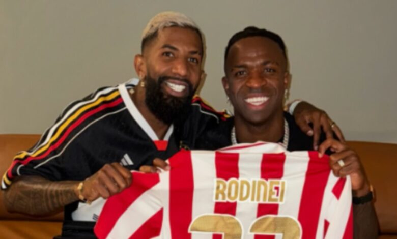 Ο Ροντινέι ο οποίος απολαμβάνει τις καλοκαιρινές του διακοπές μετά από μια δύσκολη σεζόν με τον Ολυμπιακό, θέλησε να κάνει μια ιδιαίτερη έκπληξη στον συμπατριώτη του και παίκτη της Ρεάλ Μαδρίτης Βινίσιους, προσφέροντάς του την επετειακή φανέλα των «ερυθρόλευκων» με το όνομά και τον αριθμό του στο πίσω μέρος. Ο «Βίνι» δεν δίστασε να ποζάρει χαμογελαστός με την εμβληματική φανέλα, με την φωτογραφία όπως είναι λογικό να γίνεται viral.