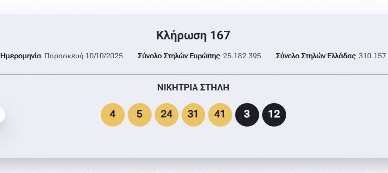 Πραγματοποιήθηκε η σημερινή (10/10) κλήρωση 167 του Eurojackpot, το οποίο μοιράζει το ποσό των 46 εκατομμυρίων ευρώ και οι αριθμοί που κερδίζουν είναι οι: 4, 5, 24, 31, 41. Τζόκερ οι αριθμοί: 3 και 12.