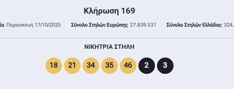 Πραγματοποιήθηκε η σημερινή (17/10) κλήρωση 169 του Eurojackpot, το οποίο μοιράζει το ποσό των 68 εκατομμυρίων ευρώ και οι αριθμοί που κερδίζουν είναι οι: 18, 21, 34, 35, 46. Τζόκερ οι αριθμοί: 2 και 3.